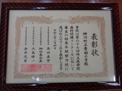 青柳小学校の取組が認められ、「年間努力賞」をいただきました。