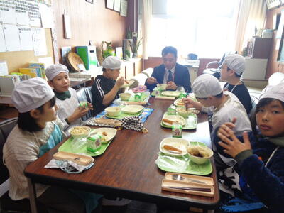 校長室で行われている6年生と校長先生との会食。