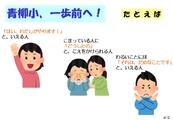 「青柳小、一歩前へ!」には、一人一人が自分から行動を起こせる人になってほしい、という願いが込められています。やりたいことがあったら、もじもじしていないで、「はい、わたしがやります!」と言える人。困っている人に「どうしたの」と声をかけられる人。そして、周りに流されず、悪いことには「それは、だめなことです」と言える人。そんな人になってほしいのです。