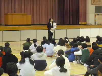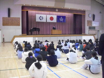 さて、皆さん、校長先生が1学期に今年のテーマはこれです!と言った話を覚えていますか。そうですね、答えてくれた子、ありがとうございます。今年のテーマは「なかよくを考えていくこと」でしたね。2学期を振り返ってみると、皆さんは、修学旅行、社会科見学、生活科見学、そして運動会と、大きな行事をみんなで協力して作り上げてきてくれました。何より校長先生が驚いたのは、みなさんが考えて、皆さんが行ってくれた「学校かくれんぼ」です。すごいこと考えましたね!「学校かくれんぼ」のおかげで、みんなが笑顔で仲良くなることができました!いろいろな行事を通して、「なかよく」の力を高めて、新しい学校を作ってきた皆さんは、本当に素晴らしいです。校長先生からもお礼を言います。「ありがとうございました」