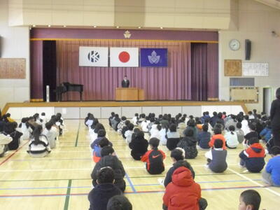 さて、今日から、いよいよ3学期がスタートします。3学期は、新しい年の始まりであると同時に、一年間のまとめを行う、とても大切な学期です。そして、次の学年への準備をする学期でもあります。そこで、校長先生から、皆さんに頑張ってほしいことを2つお話しします。