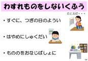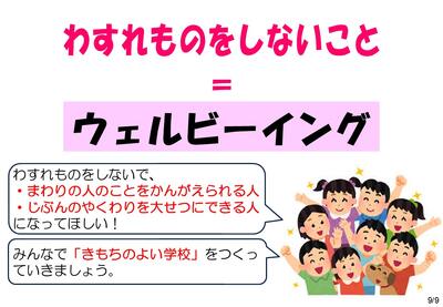 ところで皆さん、学校で忘れ物をしたことがありますか。実は、校長先生もあります。大人になってから忘れ物をしてしまったこともあります。では、忘れ物をすると、誰が困るのか考えてみましょう。まず困るのは自分ですね。習字道具を忘れて書けない。体育着を忘れてみんなと活動できない。リコーダーを忘れて吹けない。などです。さらに、まわりの人も困らせてしまいます。マスクを忘れて給食当番ができないと、他の人がやらなくてはいけません。宿題を忘れて休み時間にやると、友達とも遊べません。準備してくれた先生や、一緒に学ぶクラスの子も困ってしまいます。これは、「ウェルビーイング」の状態ではなくなってしまいます。